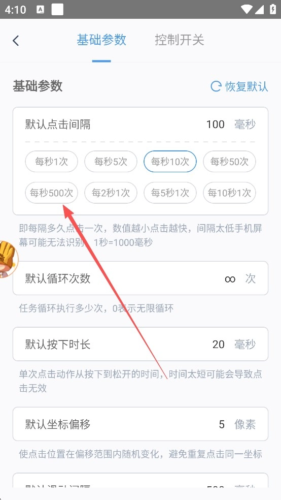 2、找到默认点击间隔与默认按下时长的设置项,将它们调整到能够实现最快点击的状态!