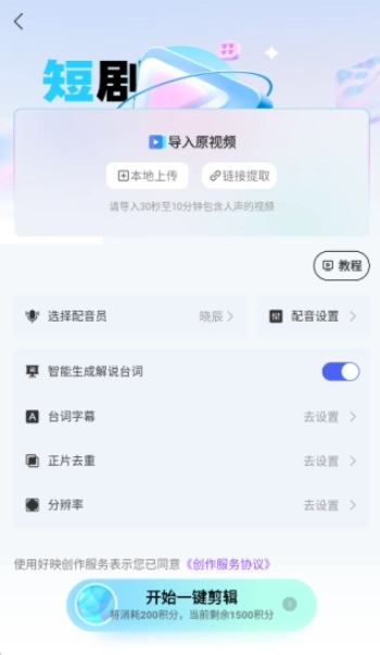 3、点击短剧解说按钮,导入原视频后,可选择配音员并让系统智能生成解说台词,还能设置台词字幕、对正片进行去重处理,此外也支持分辨率调整,完成这些设置后点击开始即可一键剪辑。